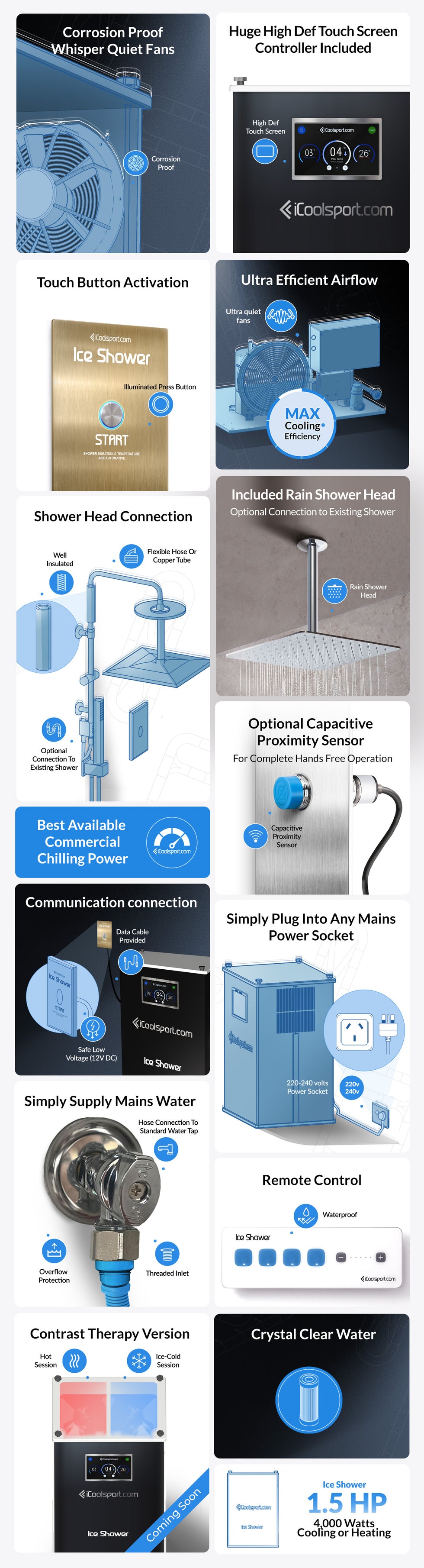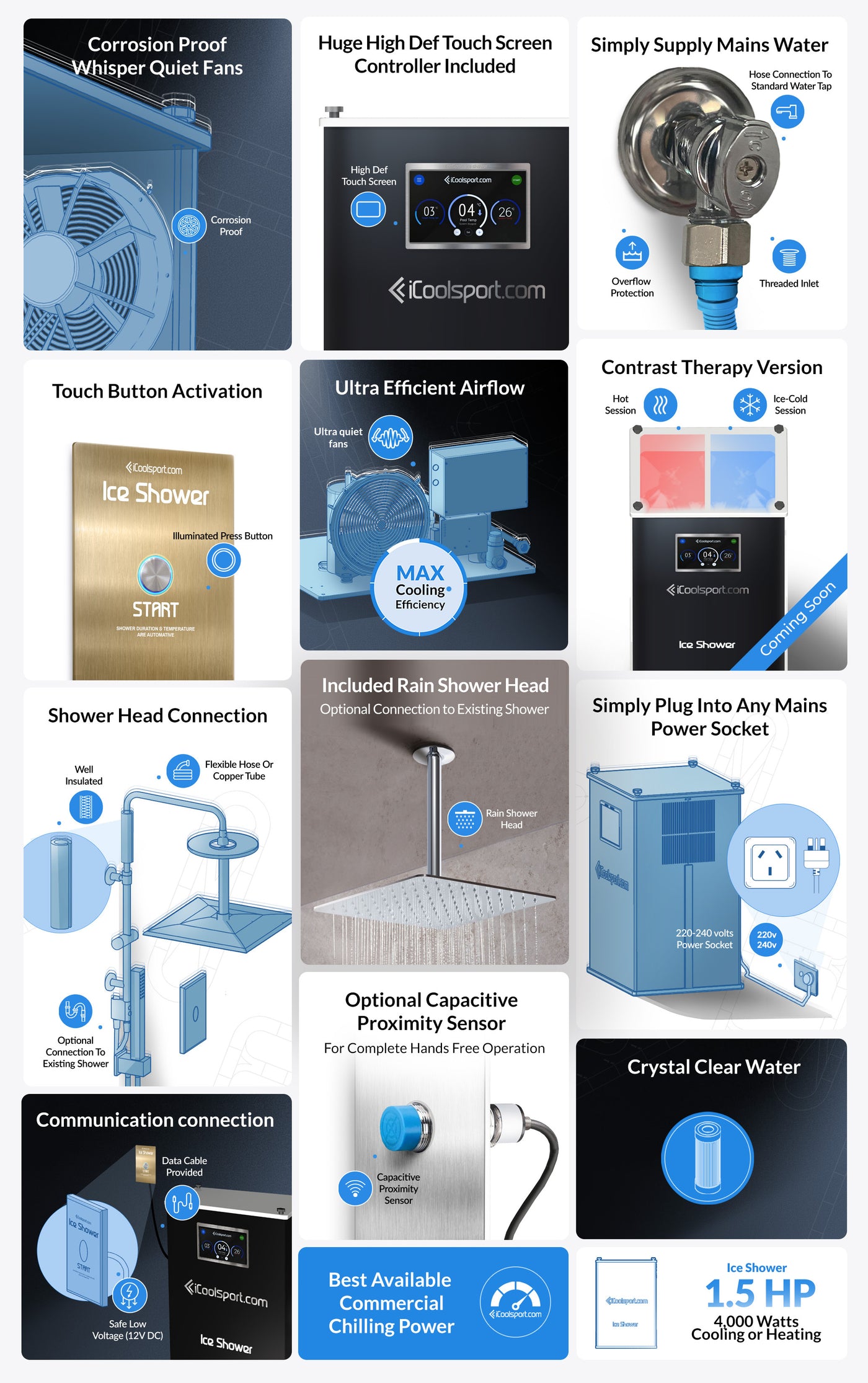 Experience the pinnacle of ice shower technology with the iCoolsport Ice Shower. This system features a 4000-watt cooling system, with ultra-quiet operation, and extremely high thermal efficiency, all housed within an entirely original design manufactured in Australia by iCoolsport.