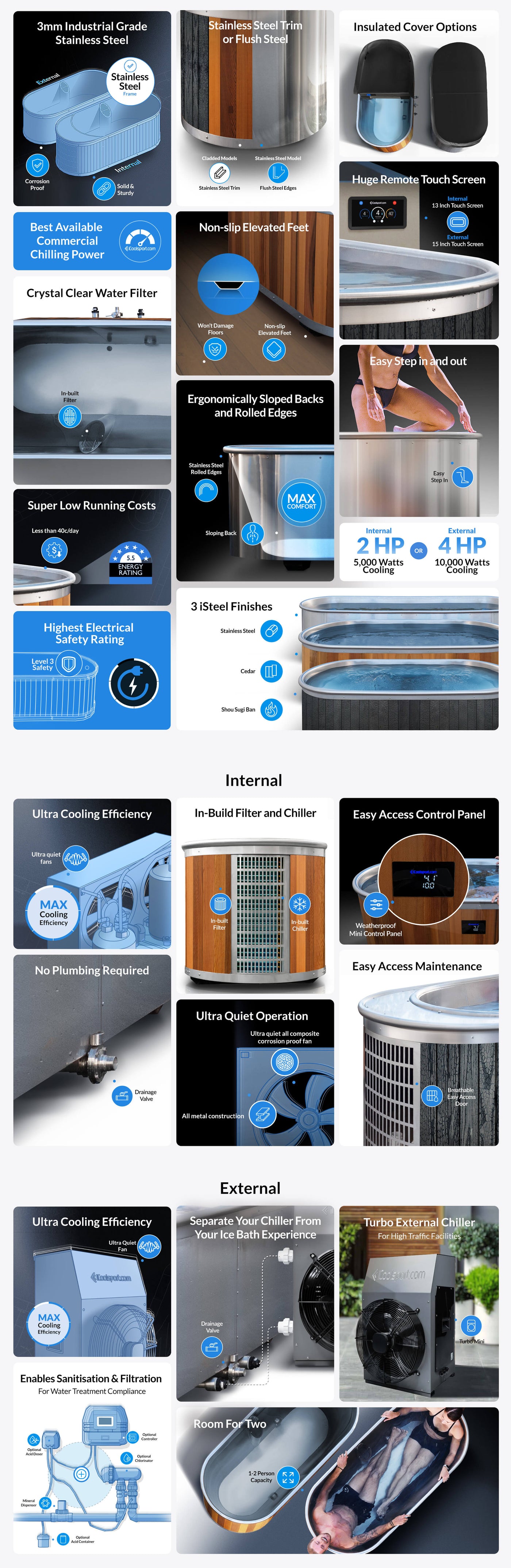 If climbing a ladder or steps to enter our deeper ice baths isn't your thing, iCool offers a level of luxury ice bathing with the iSteel so that you can step in and out.