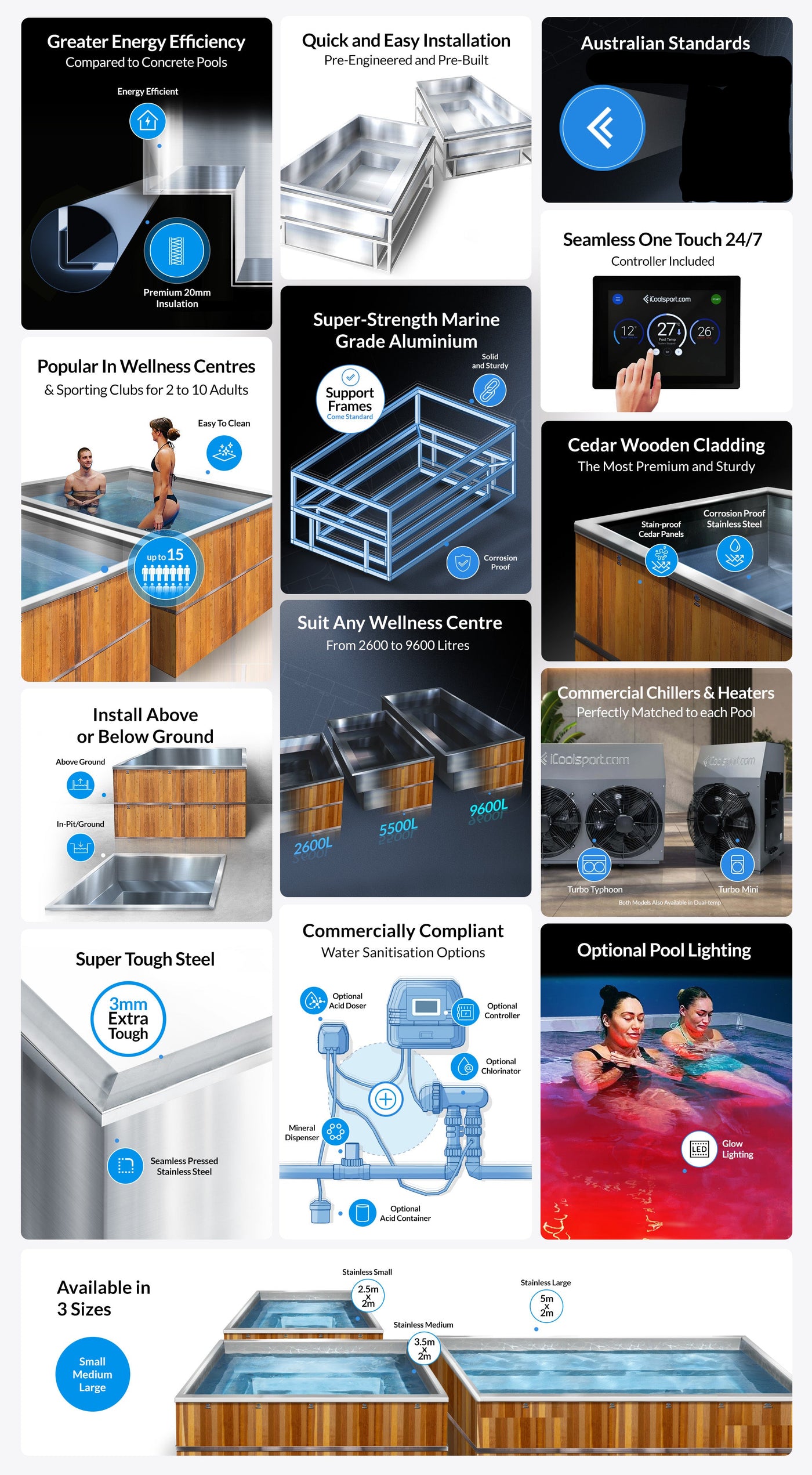Our stainless steel pools are available in three distinct sizes to suit different applications